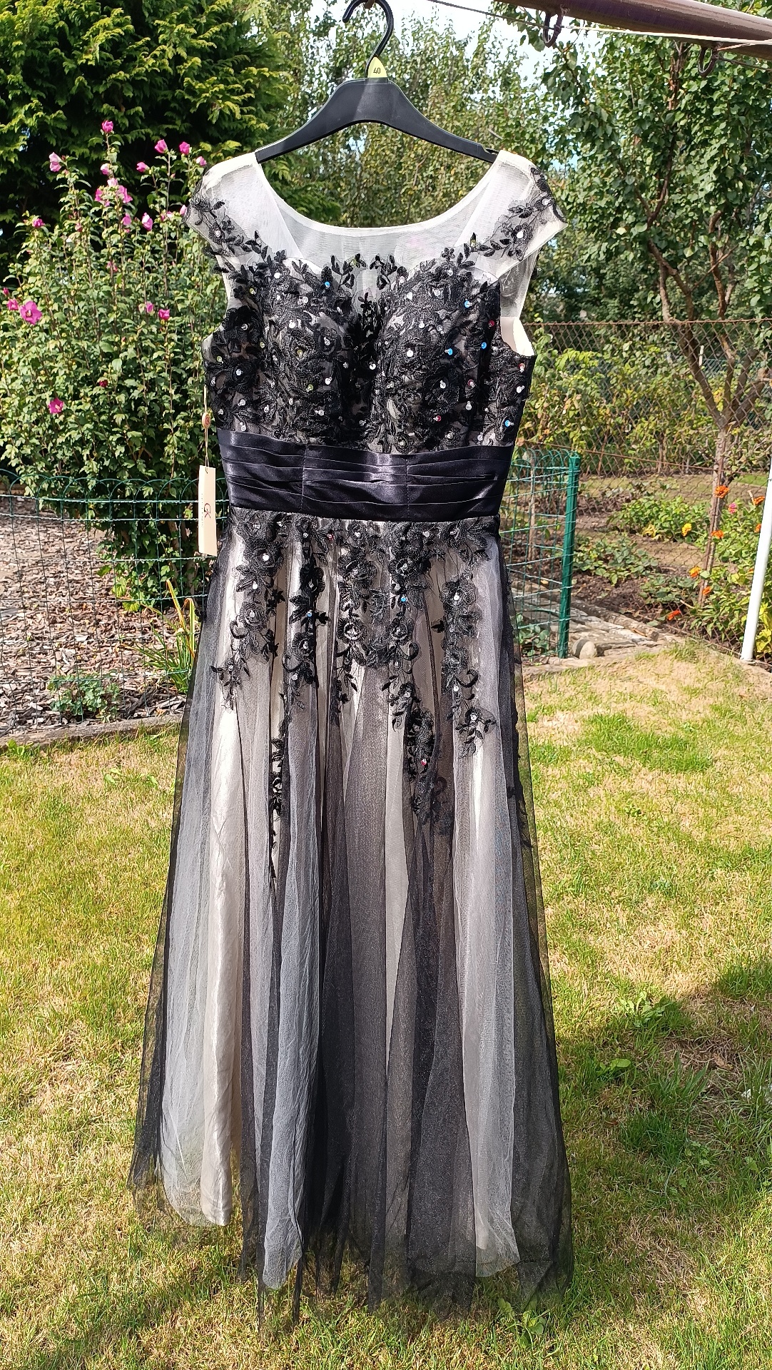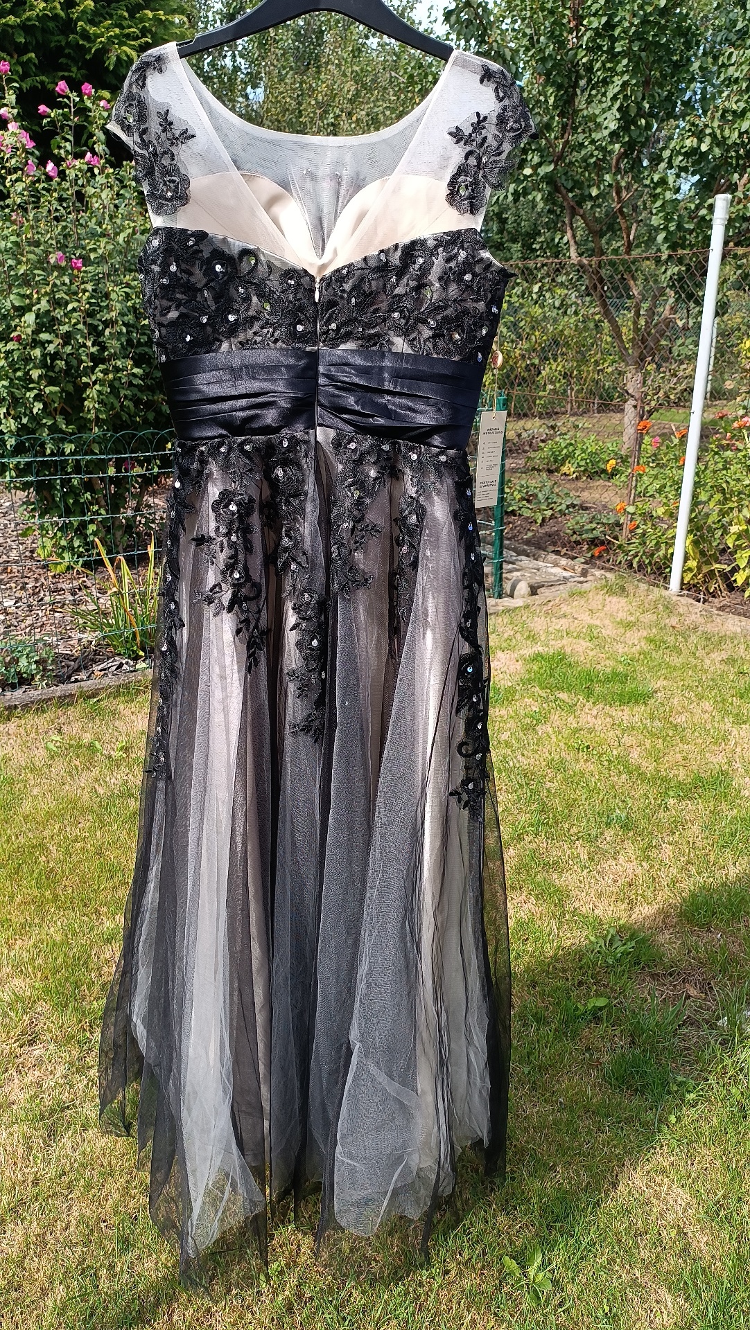 Nové šaty, velikost 36 - 38, na výšku 170 cm, spodní sukně smetanová saténová, na ní bílá tylová, horní sukně černý jemný silonový žoržet, horní díl černá krajka a stříbrné flitry.