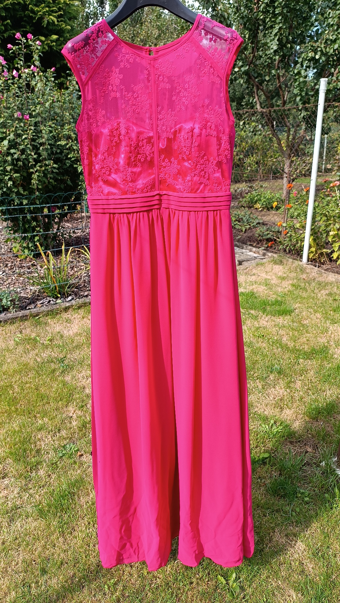 Růžové šaty 3x použité, velikost 36 - 38, na výšku 170 cm, sukně saténová růžová, horní sukně růžový žoržet, horní díl vyšívaný růžový tyl.